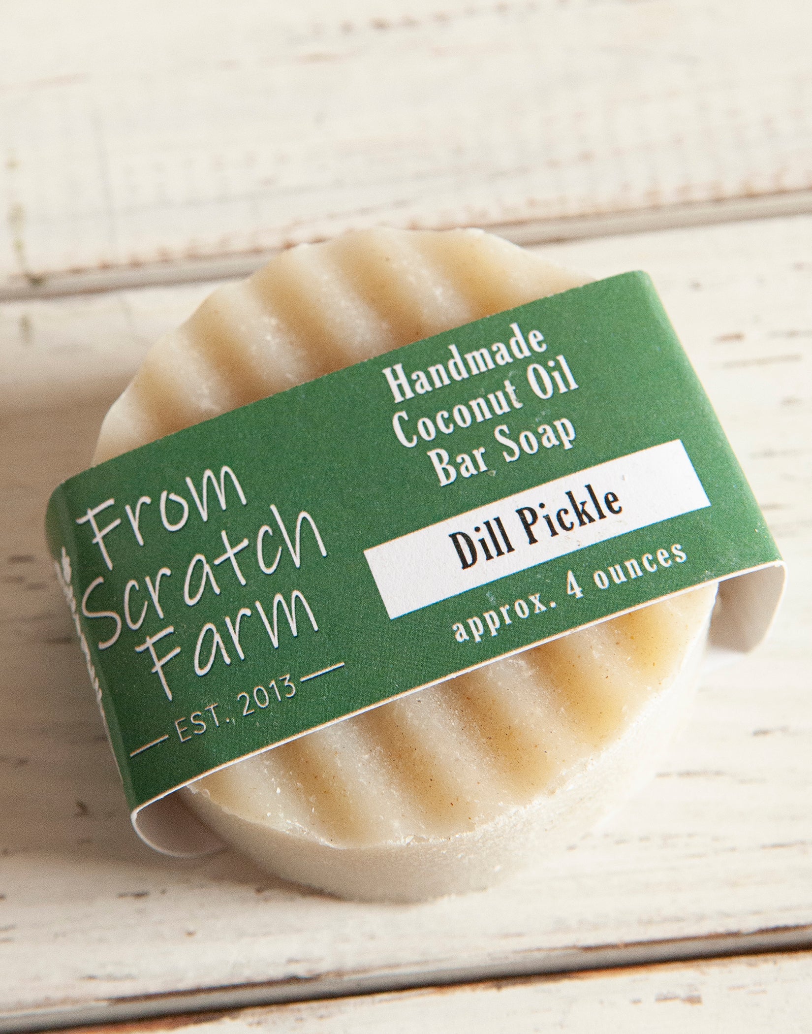 Dill Pickle & Luffa- a homegrown luffa is infused into the soap, cut with a flat soap cutter